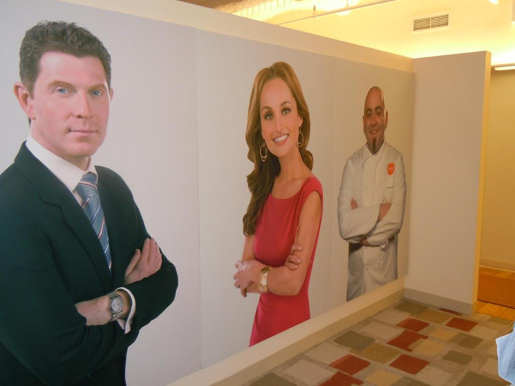We took the elevator to the third floor administrative area to meet up with our tour guide, Scott from the network’s publicity department. Scott then took us to the building’s sixth level to Food Network’s main kitchen where such shows as “ThrowDown with Bobby Flay” are filmed. In fact, we were scheduled to have this lunch a month earlier in October, but we were bumped because, at the last minute, Bobby needed the kitchen to shoot one of his shows. We rescheduled the lunch, but we were permitted to still visit at that time to take a tour and to watch Bobby in action.