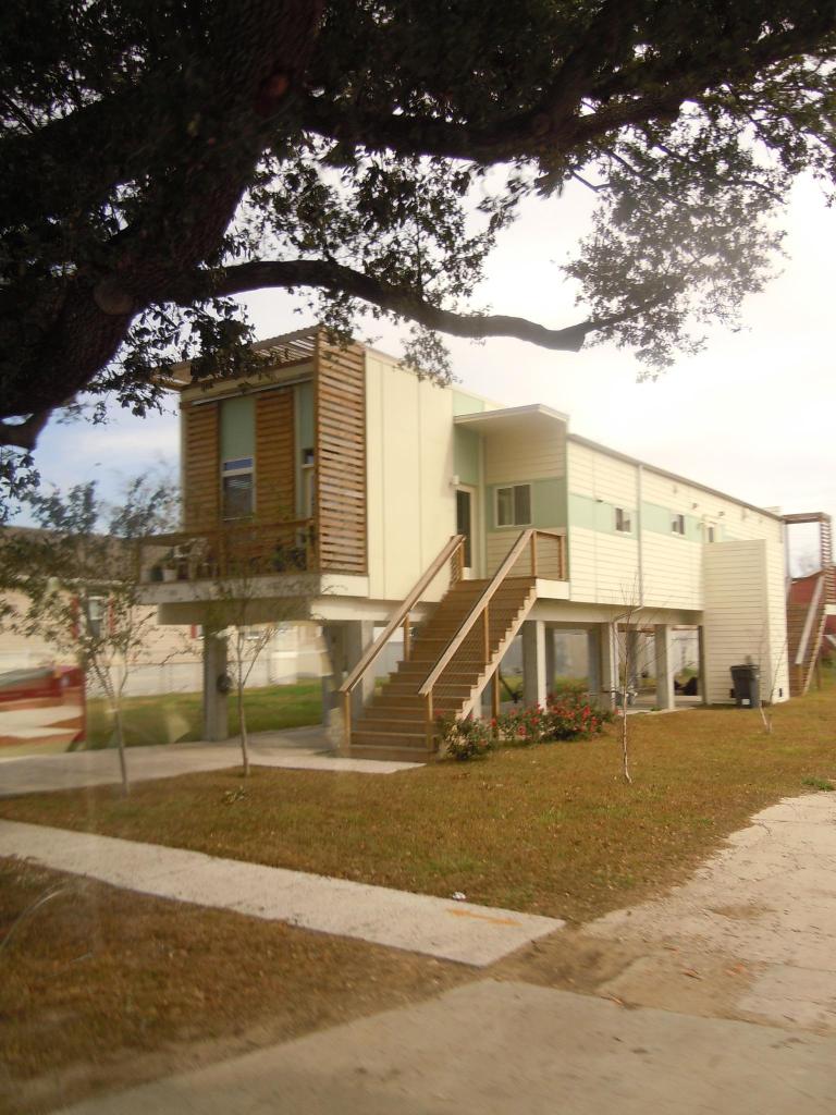 The homes are said to be eco-friendly and, in the anticipation of another flooding disaster, they are built 8 feet off the ground and have an escape hatch in the roof.