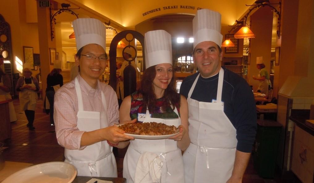 However, at the CIA’s California campus, you’re provided with an additional apron and a towel that you use to make your dishes. At the end of the class, you returned the apron and towel and brought home a clean apron as a remembrance of the event.