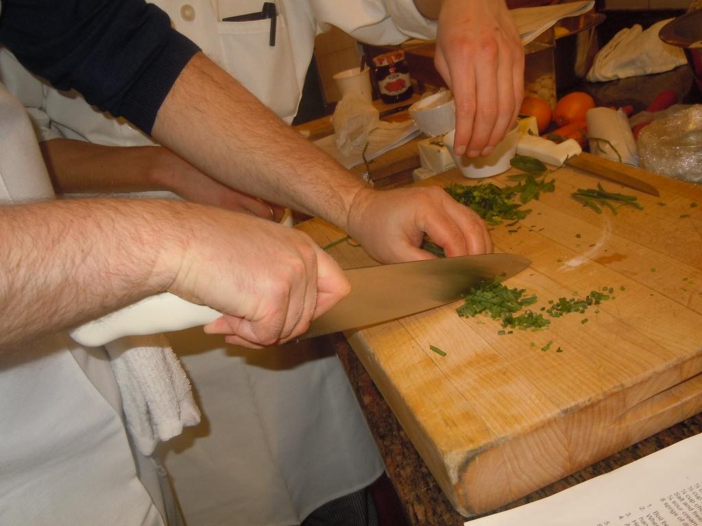 1) Facilities:Instead of cooking in a specific instructional room away from the other classes as on the Hyde Park campus, we were all cooking in the same open, airy, and very long teaching facility. This was fine- we didn’t interfere with the other classes and we could watch other cooking techniques if we had the time. We cooked in one section, the next class, “Gourmet Meals in Minutes” cooked in the next section, and the next class, “Italian Cooking at Home,” cooked in yet another section of this rectangular area. The only consideration was whether there were enough pots, pans, etc for everyone and that need seemed to be met.