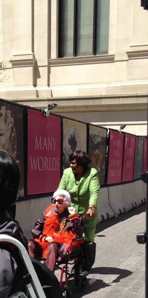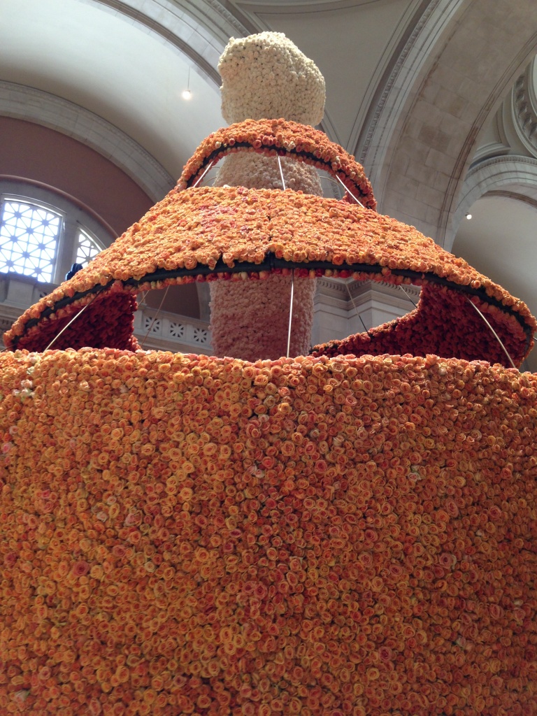 I was happy to share this experience with my daughter, Sarah, an FIT student and a bloggist for the TU’s This is College!?. At the Met previews I previously attended, I’d walk right inside through the left bottom level entrance, check in, and then wait for the preview to begin. However, this time we were all required to wait outside a bit at another entrance to allow a line of who’s who in the fashion industry who had attended the ribbon cutting event to file out of the building and onto Fifth Avenue.